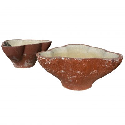 This pair of elevated shallow depth hexagon planters on sturdy footing with residual white paint patina look amazing as an outdoor feature or in a professional setting.